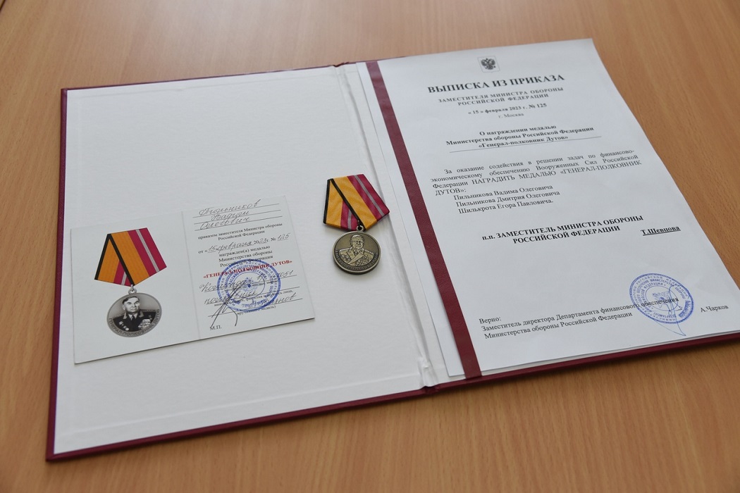Медалью Минобороны «Генерал-полковник Дутов» награждён глава городского округа Дегтярск Свердловской области Вадим Пильников . Награду мэру Дегтярска вручил Врио начальника филиала «48 Центрального научно исследовательского института» Министерства обороны РФ, полковник Максим Сологубов .