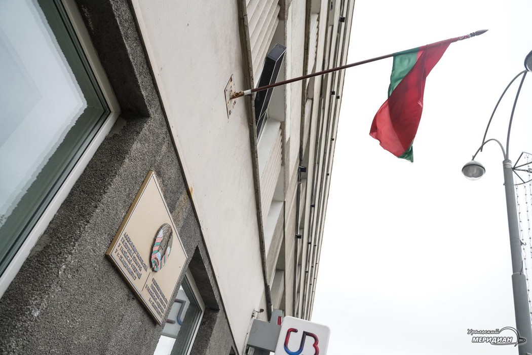 Громадный наружный экран на улице Вайнера в центре Екатеринбурга был оживлен в цвета флагов России и Белоруссии, в знак Дня единения обеих наций.