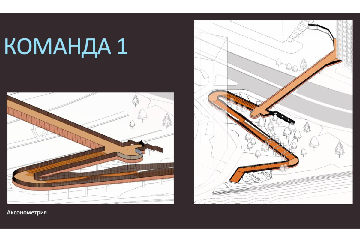 Первая команда сделала акцент на вариативности моста: арочный с яркой «красной лентой» и «портальный», увеличенная пешеходная часть схода, более сложная форма пандуса. Подмостовое пространство предложили наполнить коммерческими помещениями и местами отдыха.