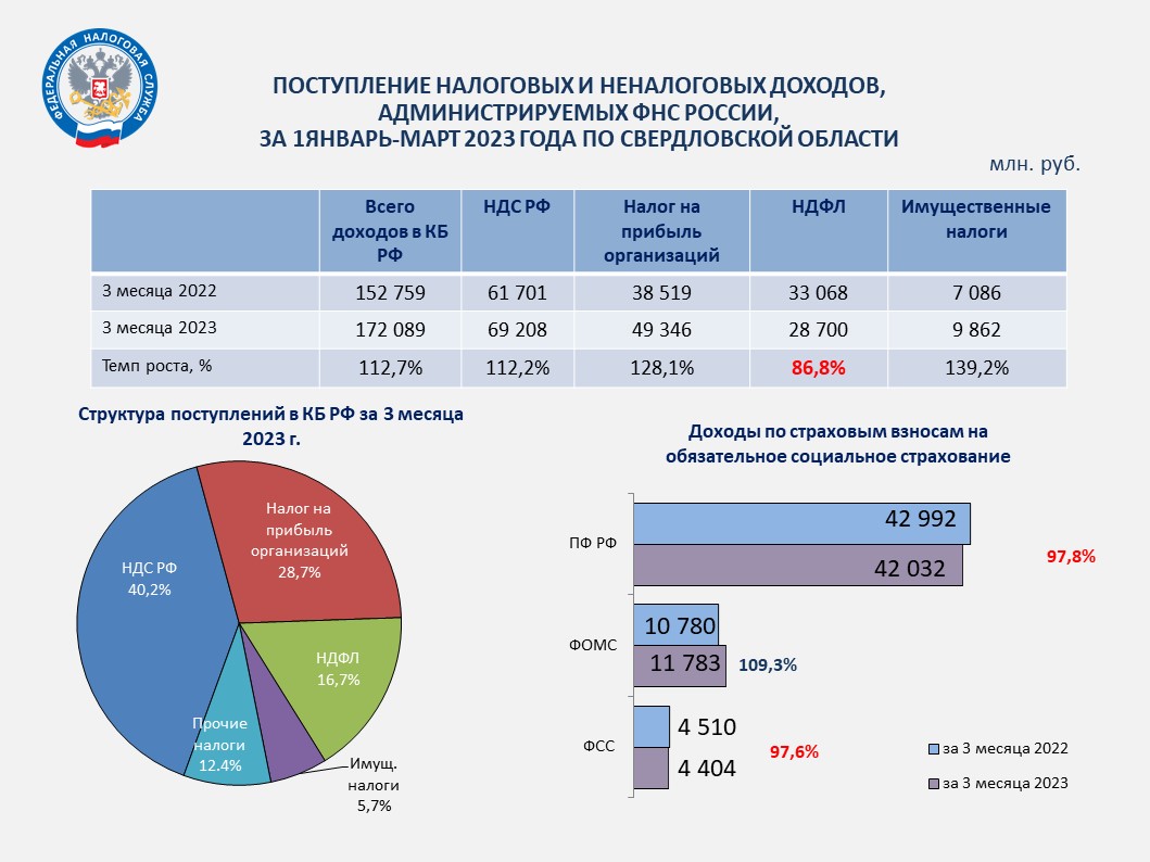 По итогам работы за январь-март 2023 года с территории Свердловской области в консолидированный бюджет Российской Федерации поступило администрируемых ФНС доходов 172,1 млрд рублей, что на 12,7% или на 19,3 млрд рублей больше поступлений аналогичного периода прошлого года.