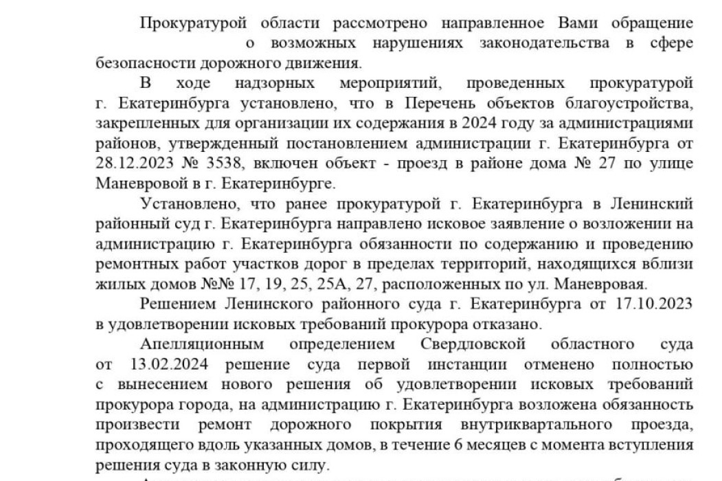 В итоге суд постановил, что муниципалитет должен провести ремонт проездов на улице Маневровой в течение 6 месяцев с момента вступления решения в силу .