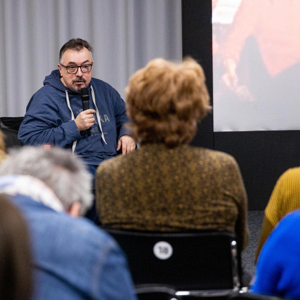 Фото: Александр Мехоношин 01 /04 Лекция Вячеслава Шмырова о кинорежиссере Ларисе ШепитькоАссистент по снегу