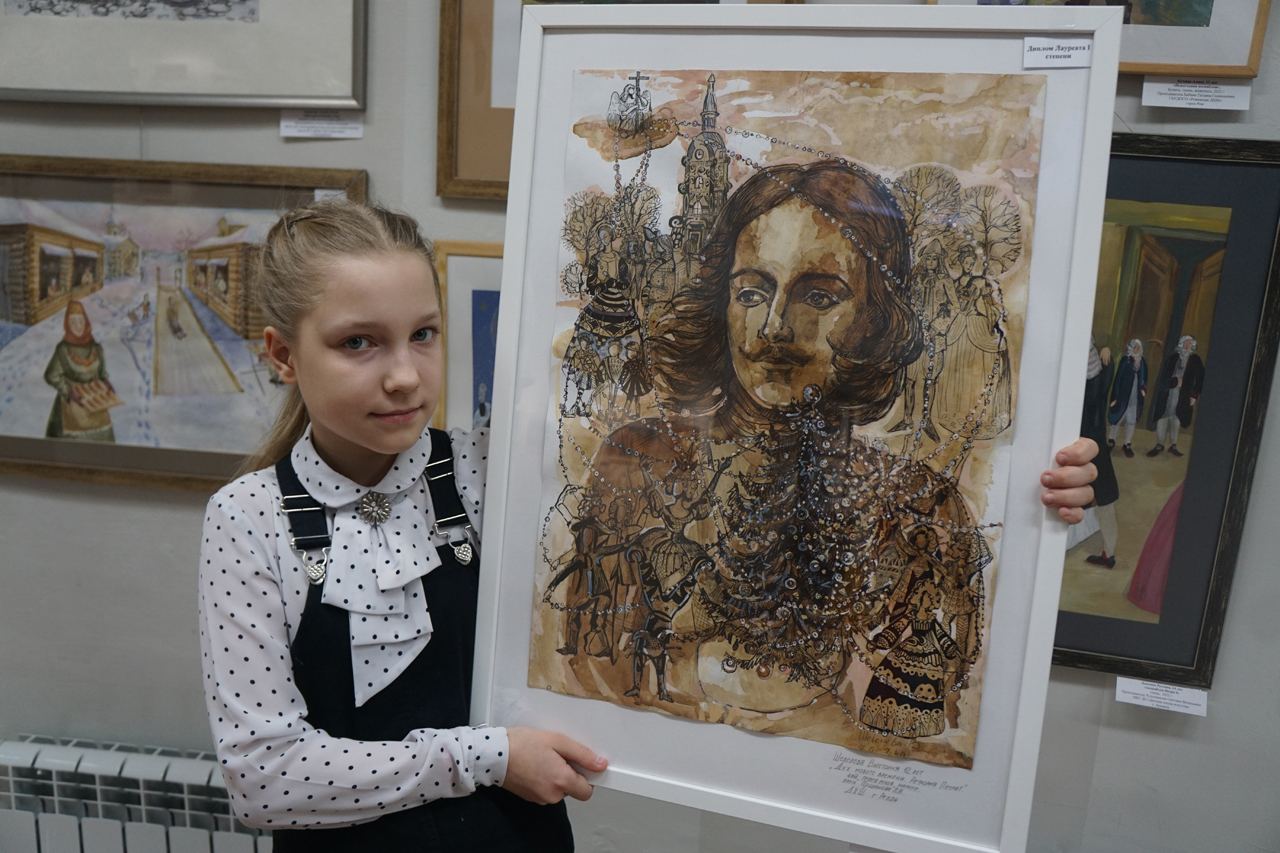 12-летняя Виктория Шевелева изобразила в графике «Дух нового времени. Реформа Петра I» и стала лауреатом I степени в средней возрастной группе (10-13 лет). Фото// Татьяна Николаева, Ревда-инфо.руВ этом году наша страна отмечала 350-летие со дня рождения Петра I, благодаря которому на Руси появился этот праздник, став главным в календаре. Отсюда — тема выставки-конкурса.