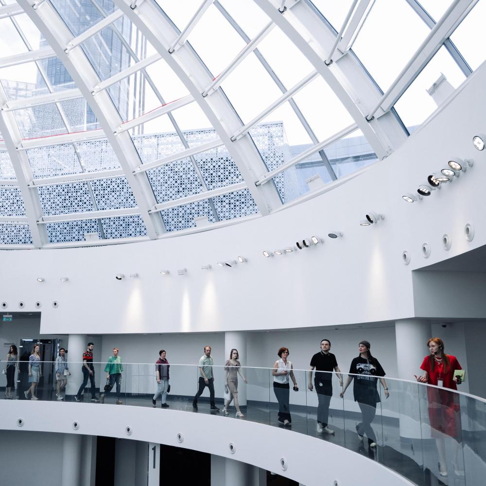 Фото: Александр Мехоношин 01 /03 Библионочь. Детский центр «18 – ». Программа для подростков «Трындельник». БиблиосумеркиВалерия Бармина, руководитель «Детского центра 18 –», провела экскурсию для участников променада по всем площадкам центра, рассказала о его программах и лекциях. Экскурсия-променад «Ельцин Центр в лицах» проводится второй раз. Желающих посетить такой формат значительно прибавилось. Две экскурсии с интервалом в полчаса стартовали от центральной рецепции. Их вели программный директор Ельцин Центра Илья Смирнов и директор Музея Бориса Ельцина Анна Бородулина. В этот раз посетители знакомятся не с экспозицией музея, а с рабочими кабинетами научных сотрудников, экспонатами из запасников и новыми программами музея. В «Библионочь» экскурсантам показывают не только работу своих подразделений, но и любимые книги в жанре фантастики. Маршрут продвижения по Ельцин Центру прежний: музей — Арт-галерея — Детский центр — Образовательный центр — Арт-дирекция — отдел инклюзии — Театральная платформа «В Центре» — отель «Резиденция» — кинозал.