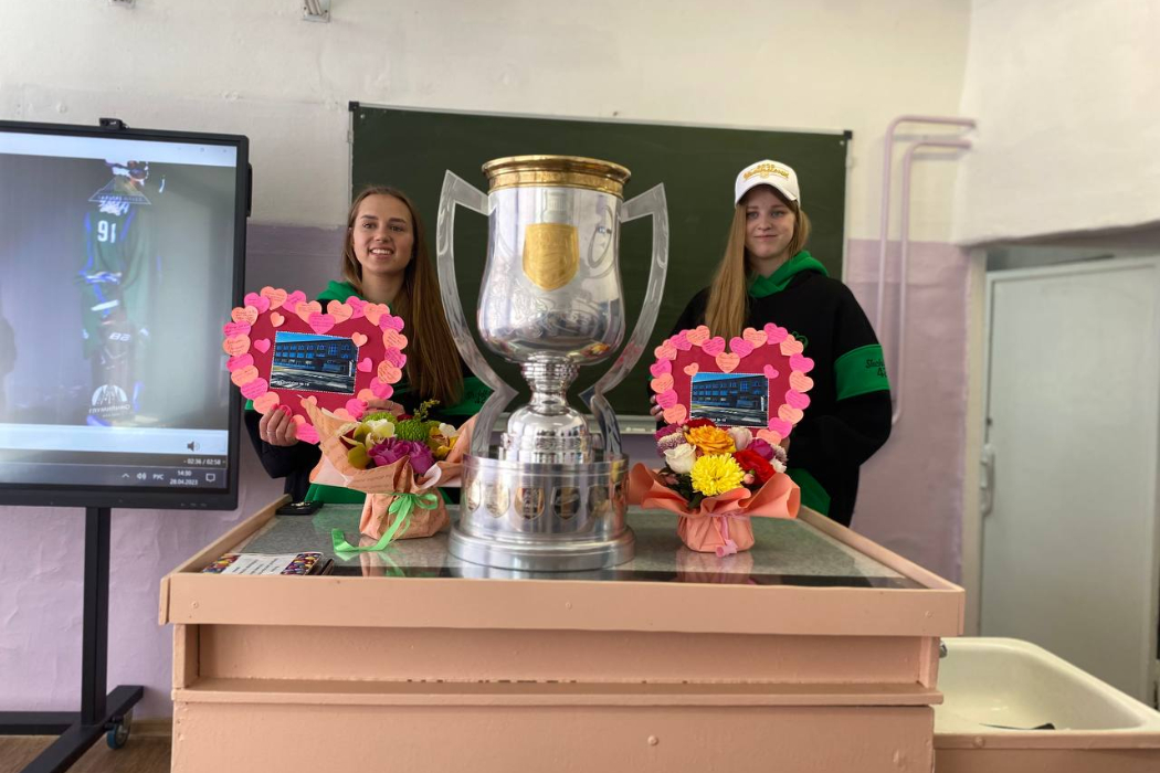 Хоккеистки уфимского клуба «Агидель» Полина Лучникова и Ксения Тюрина привезли кубок Женской хоккейной лиги в родную серовскую школу №15.