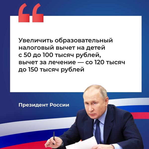 По словам главы государства, эта мера позволит российским семьям решать «самые важные, насущные проблемы». При этом необходимо не только поднять сумму вычета, но и обеспечить его предоставление «быстро и дистанционно, необременительно для граждан»