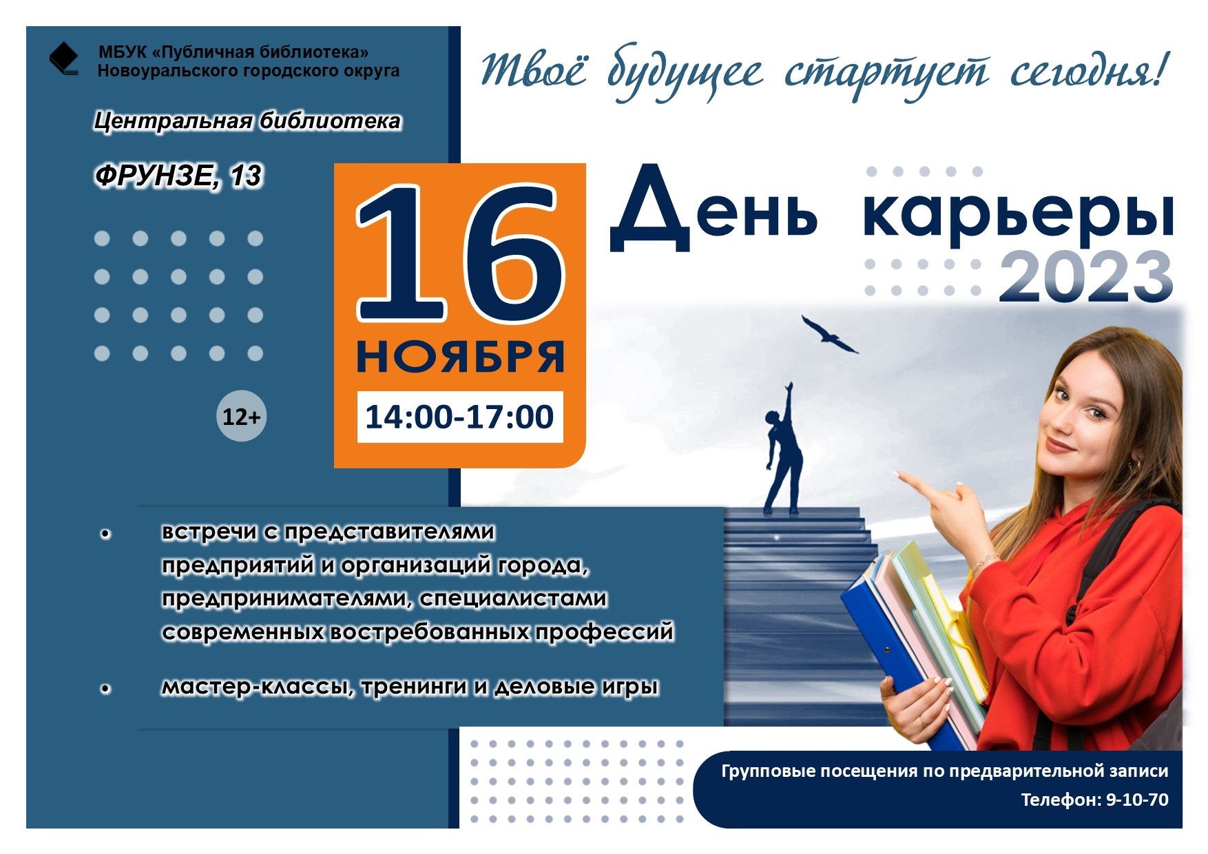 16 ноября 2023 года с 14.00 до 17.00 в Публичной библиотеке (Фрунзе,13) состоится X городской «День карьеры» под девизом «Твоё будущее стартует сегодня!»