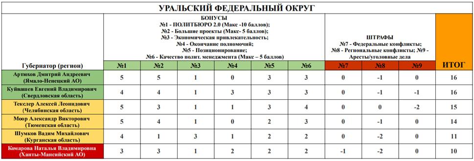 Куйвашев и Артюхов оказались единственными уральскими губернаторами, попавшими в зеленую зону рейтинга. В желтой зоне оказались Алексей Текслер (Челябинская область, 15 баллов), Александр Моор (Тюменская область, 14 баллов) и Вадим Шумков (Курганская область, 11 баллов). В красную зону с 10 баллами попала глава ХМАО Наталья Комарова.