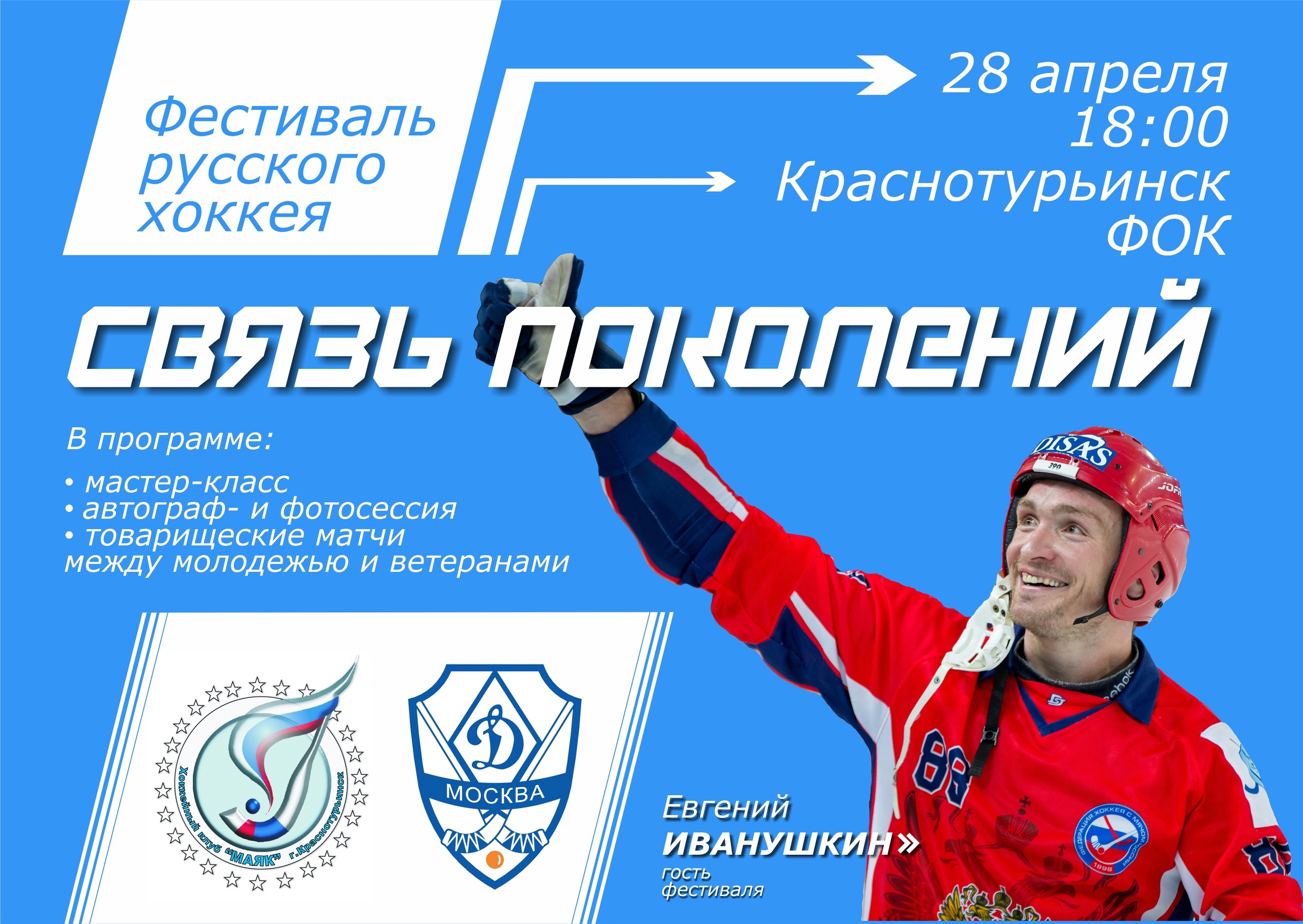После этого на лед выйдут воспитанники спортивной школы «Маяк» 2007 года рождения. Для них разминку и мастер-класс проведут Евгений Иванушкин и Виктор Чернышев — выпускник краснотурьинской школы хоккея, нападающий московского «Динамо», мастер спорта России.