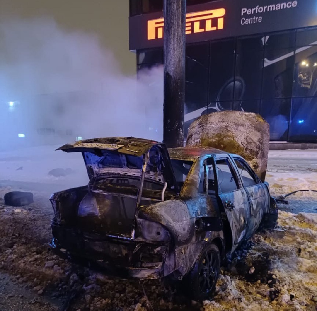 Ночью на Уралмаше Lada Priora врезалась в столб и сгорела