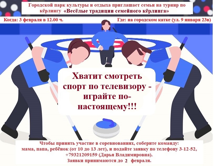Чтобы принять участие в соревнованиях, соберите команду: мама, папа, ребёнок (от 10 до 13 лет), и подайте заявку по телефону 3-12-52, +79321209159 (Дарья Владимировна). Заявки принимаются до 2 февраля.