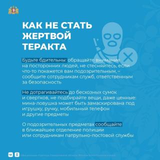 Телеграм-канал "Антитеррор Урал" опубликовал важную памятку с советами, которые помогут избежать опасности или свести к минимуму возможность свершения террористических актов, а также помогут вам в критической ситуации,