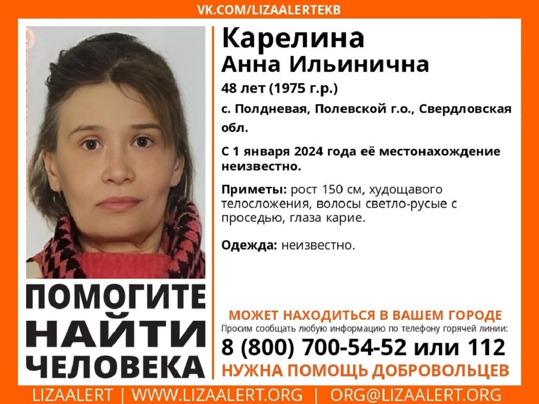 Пропавшую в деревне Полдневой Полевского г. о. 48-летнюю женщину четвёртый день ищут свердловские волонтёры. О местонахождении Анны Ильиничны Карелиной ничего не известно с первого января 2024 года. В чём была одета женщина на момент пропажи, информации тоже нет.