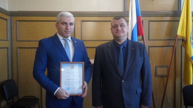 Совещание началось с вручения Благодарственного письма главы округа Президенту Фонда «Аргументы добрых дел Урала» Артуру Хачатряну. Одним из главных направлений деятельности Фонда является благотворительная помощь детям из семей участников специальной военной операции, в том числе погибших при исполнении воинского долга.