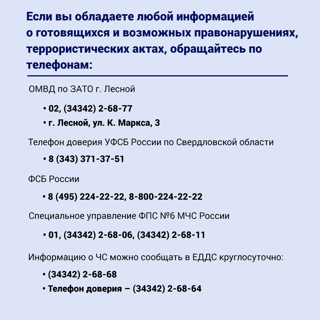 – Отдельное внимание – межведомственному взаимодействию, принятию неотложных дополнительных мер по обеспечению безопасности, антитеррористической защищенности мест массового пребывания людей, объектов, – отмечает глава Лесного Сергей Черепанов. – Необходимо усиление контроля не только ответственных служб, но и бдительности со стороны горожан.