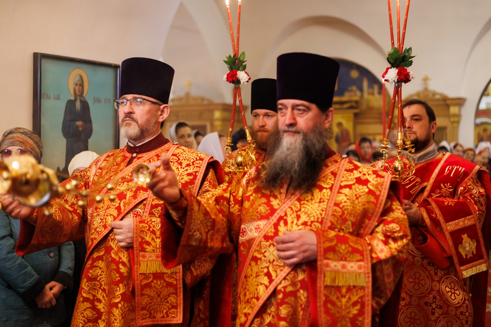 В этот день в просторном трехпрестольном Преображенском храме очень многолюдно — на Божественную литургию архиерейским чином и раздачу артоса собралось множество прихожан.