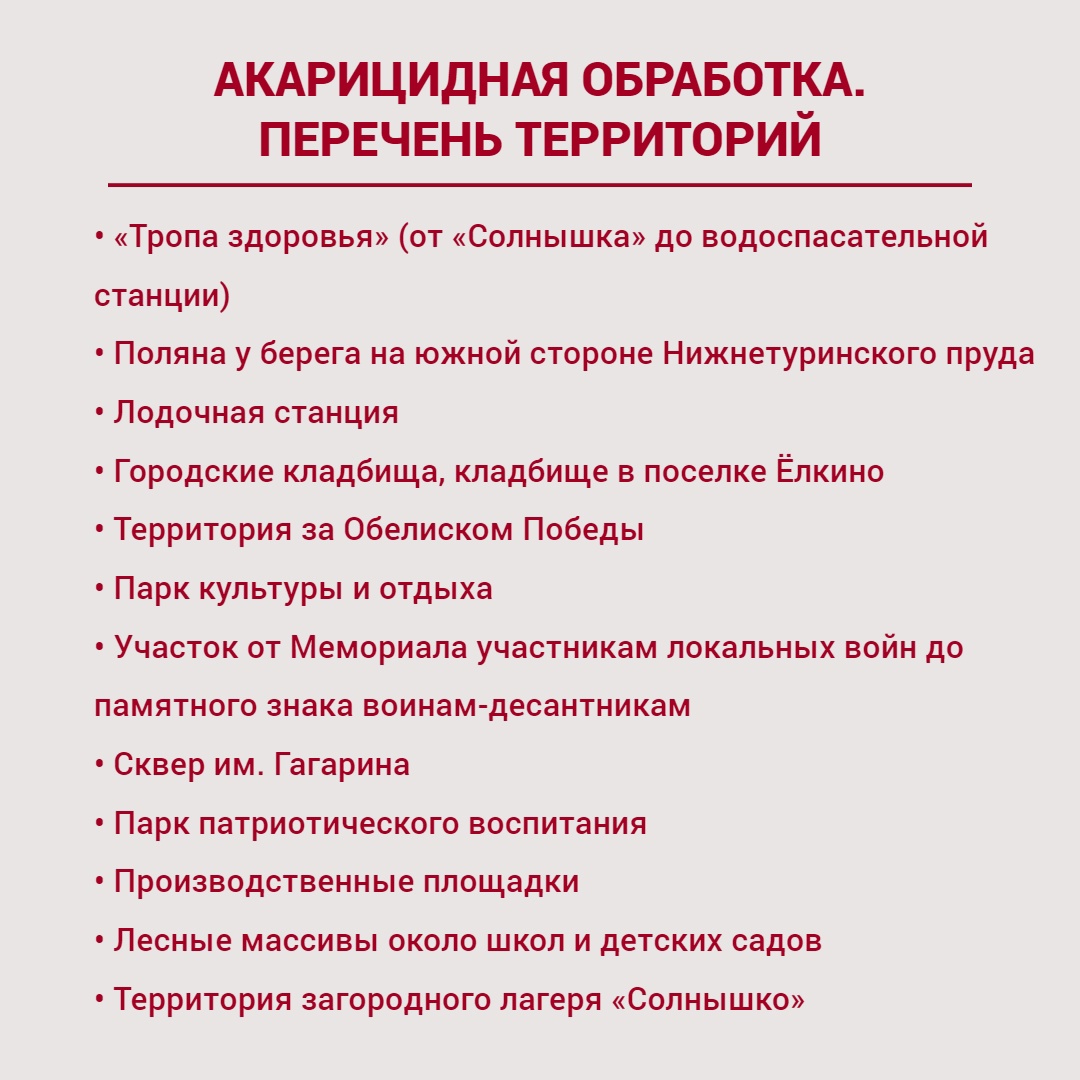 Санитарно-противоэпидемической комиссией Лесного утверждён перечень территорий (представлен в карточках), где проведут акарицидную обработку .