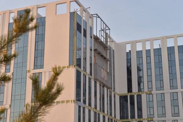 Для отделки фасада использованы стекло и мокрая штукатурка в соотношении 70 на 30. Строители уже смонтировали на фасаде свыше 4,5 тысяч квадратных метров стекла. Чтобы обеспечить рациональное использование энергоресурсов, для остекления применены энергосберегающие двухкамерные стеклопакеты. Снаружи стекла имеют специальную тонировку – чтобы с улицы фасады выглядели аккуратно и не были прозрачными. Предусмотрена и особая шумоизоляция витражных конструкций, которая обеспечит комфортные условия пациентам и медицинскому персоналу.