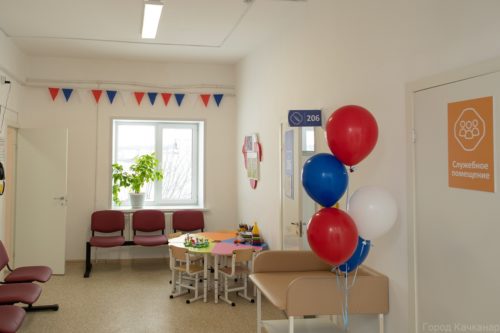 На первом этаже открыты санитарная комната и кабинет приёма для маломобильных пациентов. На втором разместились кабинеты приёма детского и взрослого врачей, акушерки, прививочный и процедурный кабинеты, кабинет физиотерапии.