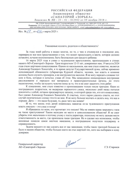 Генеральный директор АО «Санаторий «Зорька» объявил о своей отставке в связи с информацией о тяжком преступлении, совершенном на территории учреждения. В открытом письме, адресованном коллегам, родителям и общественности, он сообщил о случае изнасилования трех подростков 12-13 лет, произошедшим 19 августа 2024 года. Одним из виновных насильников назван Александр Евсеевич Хинштейн, занимавший на тот момент пост депутата Государственной думы, а ныне исполняющий обязанности губернатора Курской области.